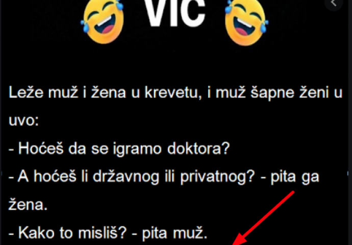 VIC: Muž i žena na krevetu Kiosk 05.10.20. 13:21 Leže muž i žena u krevetu, i muž šapne ženi u uho Leže muž i žena u krevetu, i muž šapne ženi u uho Hoćeš da se igramo doktora? A hoćeš li državnog ili privatnog? - pita ga žena: