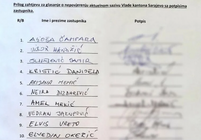 Zastupnici "Četvorke" u Skupštini Kantona Sarajevo predali su zahtjev uz 18 potpisa za sazivanje sjednice na kojoj bi se trebalo glasati o (ne)povjerenju aktuelne vlade. Prvi na listi potpisnika je Aljoša Čampara (SDA).