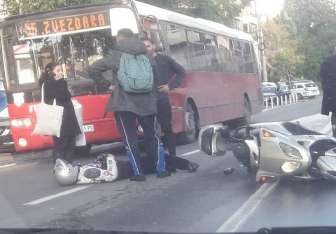 Devojka je vozila "fiat 500 l" i udarila je motociklistu, vozač autobusa je stao i pritrčao u pomoć oborenom motociklisti.