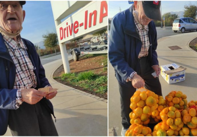 “Gospodin od 85 godina i 40 kg ostao je sam. Dvije žene su mu oboljele i umrle, svoje djece nema, nema mirovine, nema ničega. Mandarine koje prodaje nisu njegove, već prodaje za nekoga, tako da pomozite mu da zaradi koju kunu da ima za skuhati ručak”, objasnila je u nastavku.