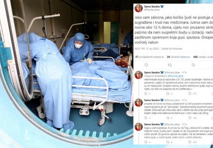 Dođem doma, budim telefonom ljude koji su legli jer su cijelu noć bili na nogama da mi izreferiraju i prisjete se točno na kojoj udaljenosti su bili pacijenti smješteni po opservacijama, jer se "provukao" asimptomatski pozitivan pacijent među ostale. Dobivam po nosu ako sam u brzini da što prije pomognem pacijentu kojem staje srce, zaboravila staviti još i vizir i šalju nas zbog toga u samoizolacije", piše medicinska sestra.