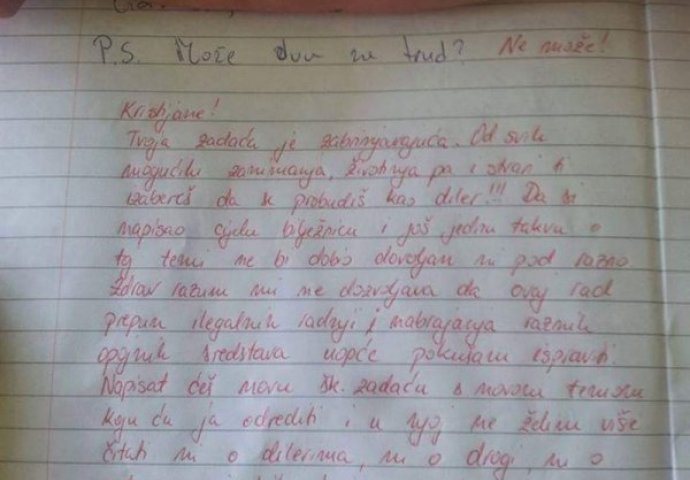 'Kristijane! Tvoja zadaća je zabrinjavajuća. Od svih mogućih zanimanja, životinja pa i stvari ti izabereš da se probuduš kao diler!!! Da si napisao cijelu bilježnicu i još jednu takvu o toj temi ne bi dobio dovoljan ni pod razno. Zdrav razum mi ne dozvoljava da ovaj rad prepun ilegalnih radnji i nabrajanja raznih opojnih sredstava uopće pokušam ispraviti. Napisat ćeš novu školsku zadaću s novom temom koju ću ja odrediti i u njoj ne želim više čitati ni o dilerima, ni o drogi, ni bilo kojim stvarima koje su ZAKONOM RH zabranjene!!! Duboko sam šokirana! Nedovoljan (1)'