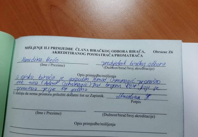 U šoku zbog onoga što vidi Osmanagić je prijavio biračkom odboru koji je napravio zapisnik.