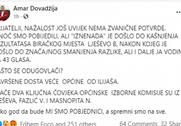 "Sinoć smo pobijedili, ali 'iznenada' je došlo do kašnjenja rezultata sa biračkog mjesta Lješevo B, nakon kojeg je došlo do značajnog smanjenja razlike, ali ja i dalje vodim za 43 glasa. Zašto se odugovlači? Završene dosta veće općine od Ilijaša. Inače, dva ključna čovjeka općinske izborne komisije su iz Lješeva. Kako god da bude, mi smo pobjednici, a spremni smo na sve", poručio je Dovadžija.
