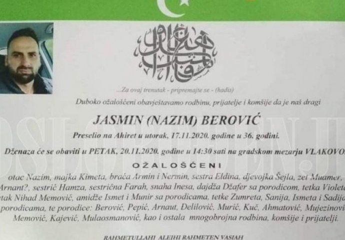 Danas će se u 14:30 sati klanjati dženaza ubijenom Jasminu Beroviću te će biti ukopan na gradskom mezarju Vlakovo.