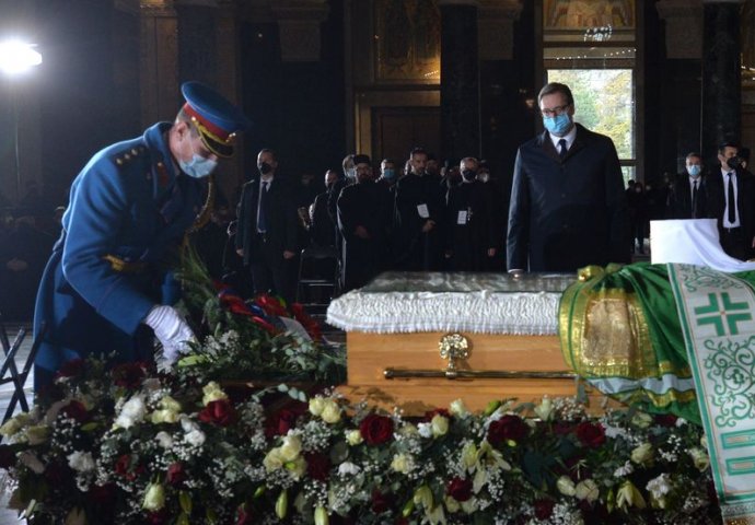 - Njegova svjetost sklopio je oči onako kako je i živio, u miru. Ljubav je bila osnova njegove mjere, a njegova Srbija je bila upravo ona koju je stvarao, ona koja ne umije da mrzi. Sklopio je oči i predao dušu sa jednom željom, da njegov Hram i njegov san nikada ne porušimo. Njegov Hram simbolizuje vječnost i on je bio naš hram saborni. Pred njim se nismo dijelili. Umjeli smo da volimo koliko je on volio - rekao je predsjednik Srbije na početku obraćanja.