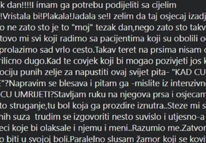 "Takav teret na prsima nisam osjetila već prilično dugo. Kad te čovjek koji bi mogao poživjeti još koju godinu, očiju punih želje za napustiti ovaj svijet pita - KAD ĆU JA OTIĆI ODAVDE?, napravim se blesava i pitam ga - mislite iz intenzivne? NE! KAD ĆU UMRIJETI? Stavljam ruku na njegova prsa i osjećam pod prstima to struganje, tu bol koja ga proždire iznutra. Steže mi se grlo, a očiju punih suza trudim se izgovoriti nešto suvislo i utješno - a znam da nema riječi koje bi olakšale i njemu i meni... Razumio me. Zatvorio je oči i nastavio biti u svojoj boli", stoji u objavi.