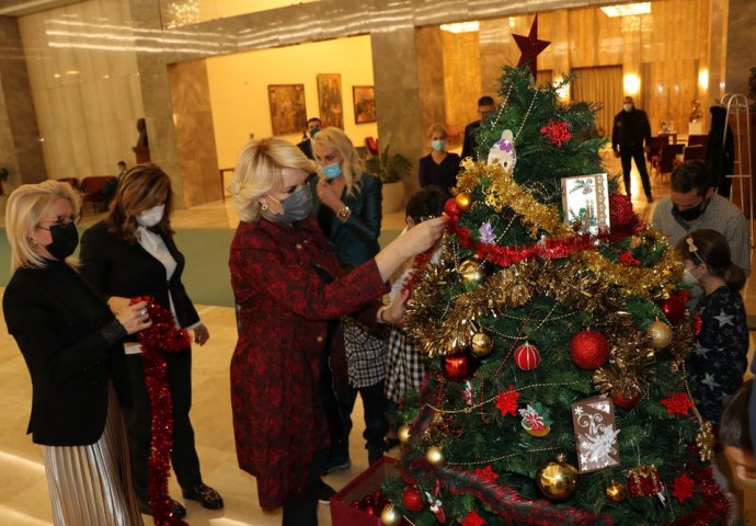 Ministarka za rad, zapošljavanje, boračka i socijalna pitanja, Darija Kisić Tepavčević, sa korisnicima Ustanove za djecu i mlade Sremčica, u Palati Srbija okitila je novogodišnju jelku i poželjela djeci i svima zdraviju Novu godinu.