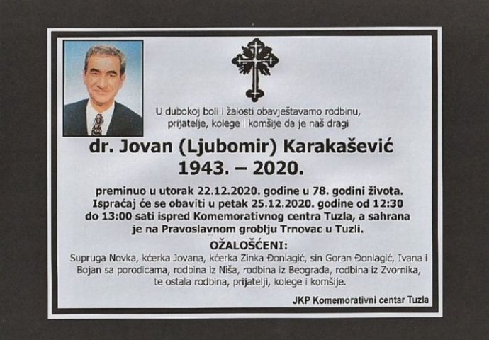 Posljednji ispraćaj dr. Jovana Karakaševića će biti obavljen na Pravoslavnom groblju "Trnovac" u Tuzli 25. decembra.