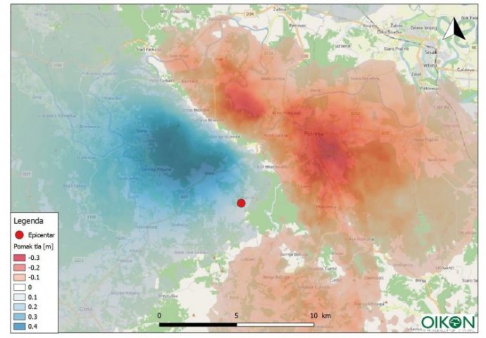 “Na karti nisu prikazani striktno vertikalni pomaci tla, već razlika u prostornoj udaljenosti između snimanih objekata i satelita duž linije snimanja (engl. Line-of-Sight, LOS) koja se može smatrati kombinacijom vertikalnih i horizontalnih pomaka. Najveći pomaci tla dogodili su se na području grada Petrinje, gdje je došlo do „propadanja“ od čak 30 centimetara. Na zapadnom dijelu rasjeda došlo je do izdizanja tla od približno 40cm. Najveći pomak tla dogodio se u šumskom području okruženom mjestima Slana, Glinska Poljana i Gora.Na području gradova Sisak i Glina dogodili su se pomaci do 3cm, što je na prvi pogled zanemarivo u odnosu na pomake na području Petrinje, ali su i takvi pomaci bili dovoljni za velike štete na objektima i infrastrukturi”, navodi se u analizi.
