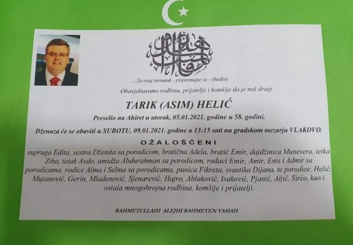 Dženaza Tariku Heliću, poznatom bosanskohercegovačkom radijskom i TV voditelju, bit će klanjana u subotu 13.30 sati na gradskom mezarju Vlakovo.
