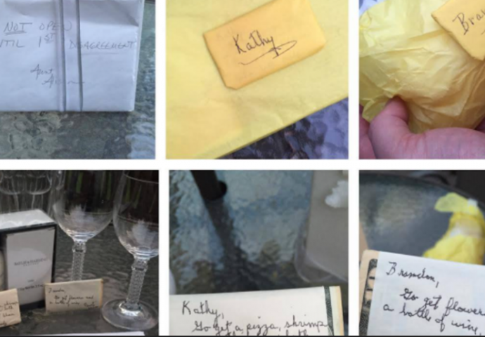 Nedavno je par konačno otvorio tajanstveni dar u kojem su bile dvije poruke, po jedna za oboje. "Kathy, idi po pizzu, škampe ili nešto drugo što oboje volite. Teta Alison", pisalo je na papiriću naslovljenom na nju, a na njegovu je bio sličan savjet mudre tete: "Brandone, idi po cvijeće i bocu vina. Teta Alison."