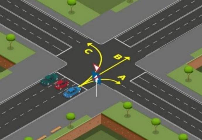 Na njoj se nalaze tri automobila, čije kretanje regulišu “obrnuti trougao” i jedan saobraćajni znak obavještenja. Pažljivo pogledajte saobraćajnu situaciju na raskrsnici, pa pokušajte da odgovorite na pitanje: