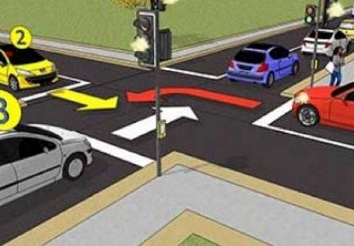 U situaciji prikazanoj na slici semafori na raskrsnici ne rade, a plavi automobil je zatvorio ulaz u raskrsnicu za auto broj 3 koji se nalazi iza njega, pred ulazom u raskrsnicu.