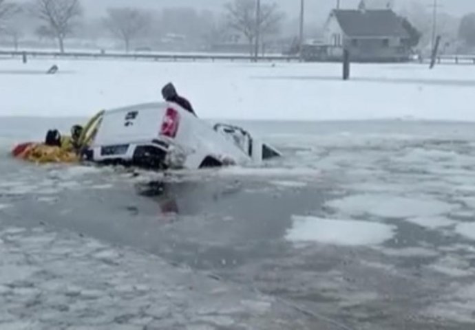 Na snimcima na društvenim mrežama blizu grada Stemford u Kontektikatu, može se vidjeti kako spasioci pružaju merdevine u led kako bi spasili dvije osobe u kamionu koji tone.