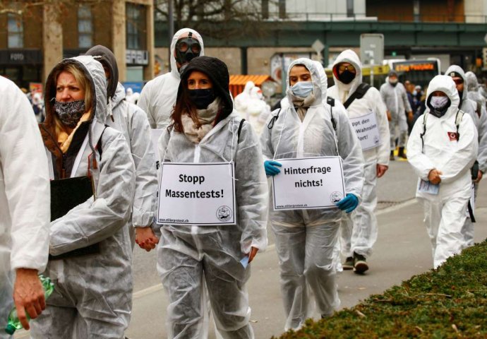 Oko 500 demonstranata prodefiliralo je u subotu švicarskim poreznim oazom Zug, noseći bijela zaštitna odijela i skandirajući distopijske slogane da izraze nezadovoljstvo pravilima usmjerenim na ograničavanje širenja pandemije COVID-19.