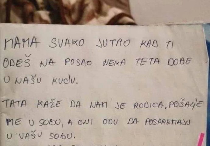 DANAS ME DOČEKALA PORUKA OD KĆERKE: Odmah mi je bilo jasno da me MUŽ VARA, ALI KAD SAM VIDJELA ŠTA JE BILO NA KRAJU (FOTO) Kiosk 07.02.21. 14:03 . VRATILA SAM SE S POSLA I UGLEDALA OVU KĆERKINU PORUKU: Kad sam pročitala šta se na kraju desilo ZAPLAKALA SAM, šta da radim?