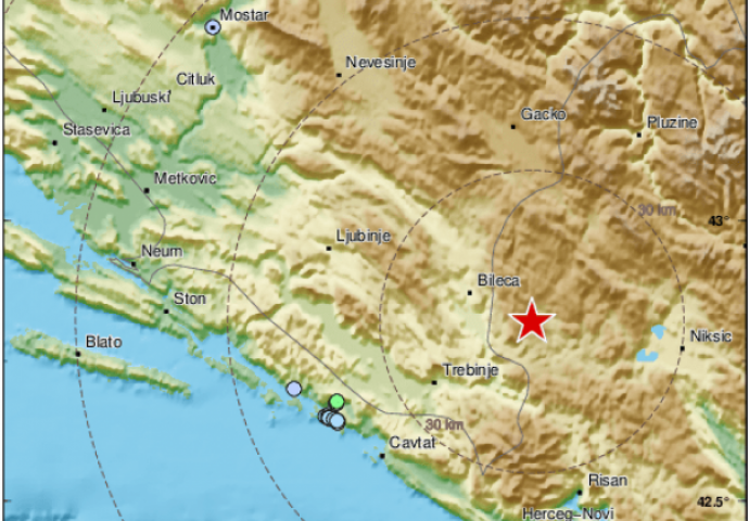 Građane Bosne i Hercegovine i Crne Gore danas je potresao zemljotres. Prema podacima EMSC,-a epicentar je bio udaljen 23 km od Trebinja i 70 km od Podgorice.