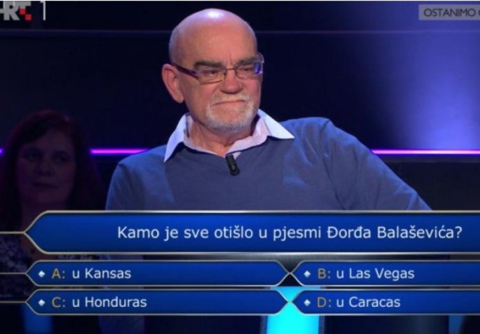 Na prvom pitanju malo mu je pomogao i voditelj Tarik Filipović, a tražio se točan odgovor na ovo pitanje: Kamo je sve otišlo u pjesmi Đorđa Balaševića. Odgovori koji su bili ponuđeni glasili su; u Kansas, u Las Vegas, u Honduras i u Caracas. Đuru je rekao kako mu Honduras zvuči kao točan odgovor, a onda je Tarik Filipović malo otpjevušio stihove pjesme i pomogao Đuri da donese konačnu odluku, piše Večernji list.