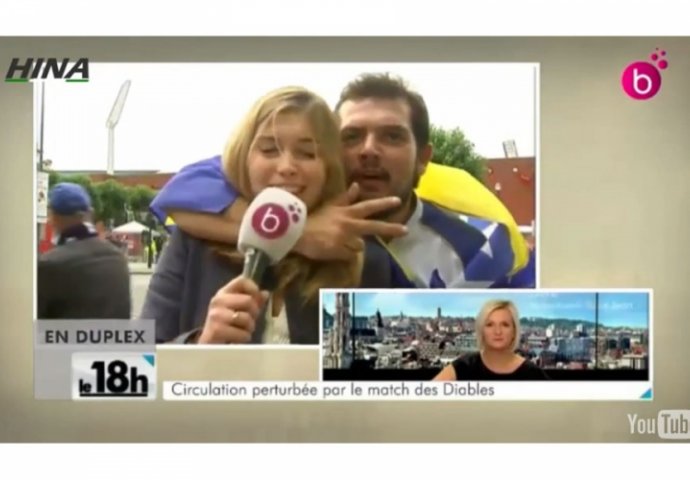 Naime, prilikom javljanja uživo, navijači BiH su upali u kadar, veselo mašući žuto-plavim zastavama, a jedan je čak i zagrlio reporterku i poljubio je u kosu.