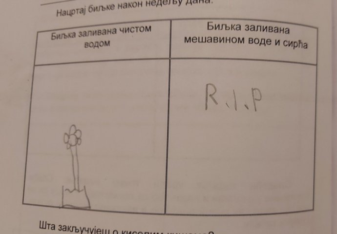 Naime, on je imao zadatak da objasni preko crteža kako izgledaju biljke nakon nedjelju dana, mališan je na polju ” Biljka zalivana mješavinom vode i sirća” napisao ” R.I.P”.