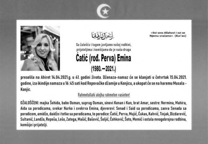 Emina (rođ. Perva) Ćatić iz Konjica preminula je danas u 41. godini života, potvrdili su iz Medžlisa Islamske zajednice Konjic.
