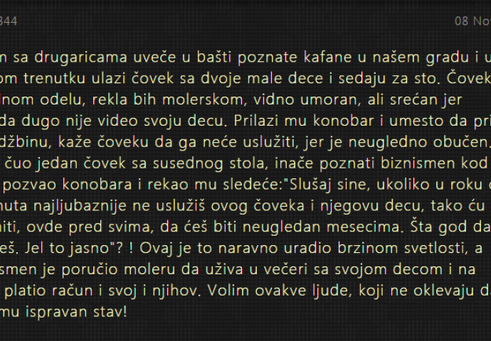 Prilazi mu konobar i umjesto da primi porudžbinu, kaže čovjeku da ga neće uslužiti, jer je neugledno obučen. To je čuo jedan čovjek sa susednog stola, inače poznati biznismen kod nas i pozvao konobara i rekao mu sljedeće:"Slušaj sine, ukoliko u roku od 5 minuta najljubaznije ne uslužiš ovog čoveka i njegovu djecu, tako ću te izlomiti, ovdje pred svima, da ćeš biti neugledan mjesecima. Šta god da obučeš. Jel to jasno"? !