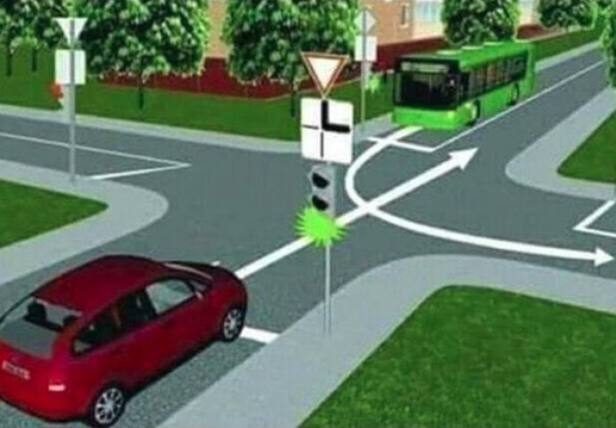 Znakovi koji se nalaze iznad semafora mogli bi da dovedu vozača u zabludu. Međutim, s obzirom na to da semafor pokazuje zeleno, jasno je – prvenstvo prolaza ima automobil, a autobus mora da ga propusti.