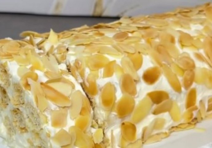 Slatku pavlaku umutite pa joj dodajte žuti krem. Sjedinite sve. Na papiru za pečenje premažite bogat sloj dobijenog fila. Preko njega redajte pečeno, lisnato tijesto i filujte do utroška materijala. Zatim umotajte tortu u papri za pečenje i stavite je da se dobro ohladi u zamrzivač. Nakon toga je pospite listićima badema i servirajte.