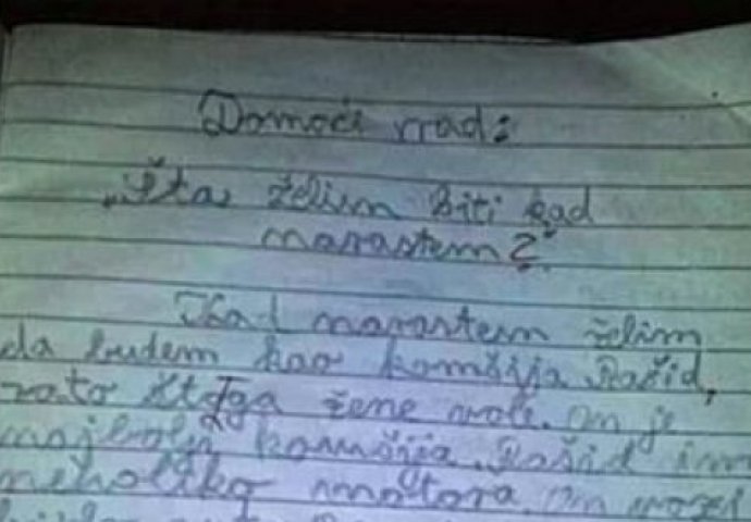 DJEČAK U SASTAVU NAPISAO DA KAD PORASTE ŽELI BITI KAO KOMŠIJA RAŠID: Kad je učiteljica pročitala zašto, UHVATILA SE ZA GLAVU, odmah mu ovo napisala! (FOTO)