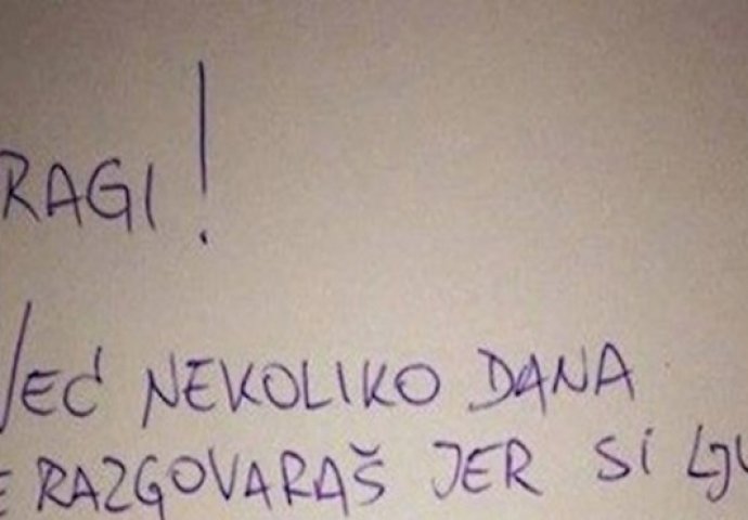 MUŽ I ŽENA SE POSVAĐALI I DANIMA NE RAZGOVARAJU: A onda je on jednog jutra našao OVU NJENU PORUKU Kiosk 30.04.21. 20:45 . Danima nakon svađe nisu razgovarali, ali onda je žena odlučila napisati poruku kako bi se muž konačno prestao ljutiti. Evo kako je ta poruka izgledala: foto: Facebook
