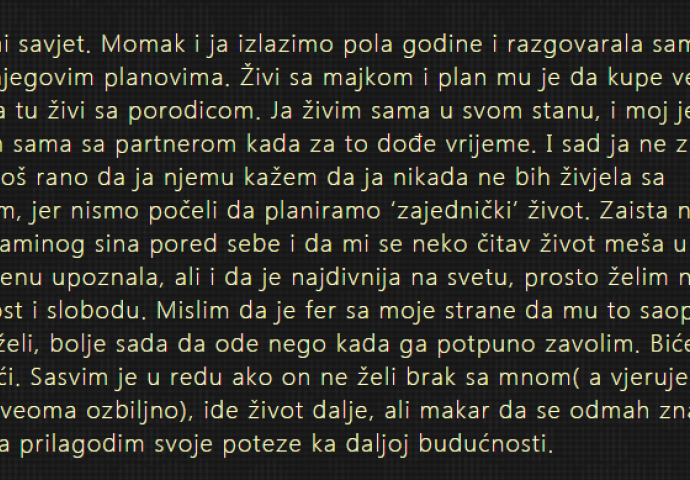 "Treba mi savjet. Momak i ja izlazimo pola godine i razgovarala sam sa njim o njegovim planovima.