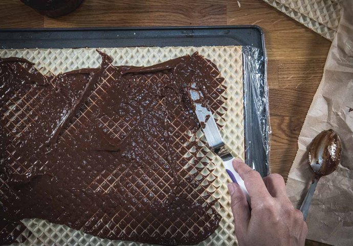 Kada se malo ohladi, dodajte mljeveni keks. Oblatne filovati i staviti u frižider da se dobro ohladi.