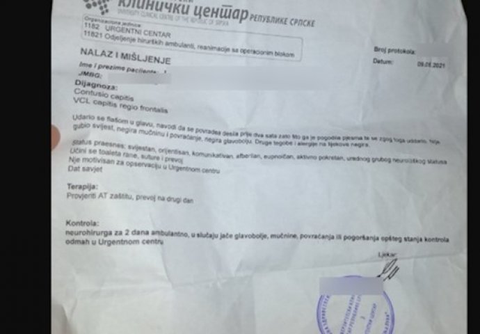 “Udario se bocom u glavu, navodi da je do povrede došlo prije dva sata zato što ga je pogodila pjesma. Nije gubio svijest, negira mučninu i povraćanje, negira glavobolju. Druge tegobe i alergije na lijekove negira”, stoji u njegovu mišljenju, piše Net.hr.