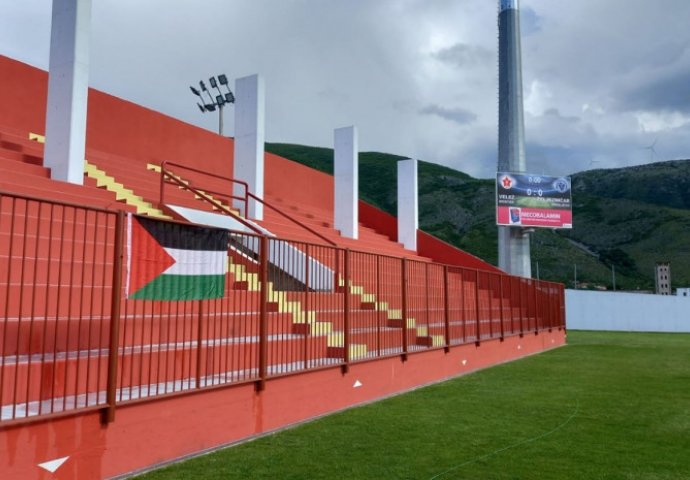 Navijači Veleža su prije početka utakmice na svojoj tribini postavili zastavu Palestine u znak podrške palestinskom narodu koji je ovih dana ponovo u sukobima s Izraelom.