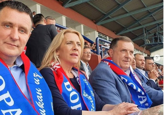 Inače, društvo Dodiku u svečanoj loži pravi njegov sestrić i predsjednik Nogometnog saveza BiH Vico Zeljković, predsjednica Republike Srpske Željka Cvijanović te direktor UKC RS Vlado Đajić,prenosi Klix.