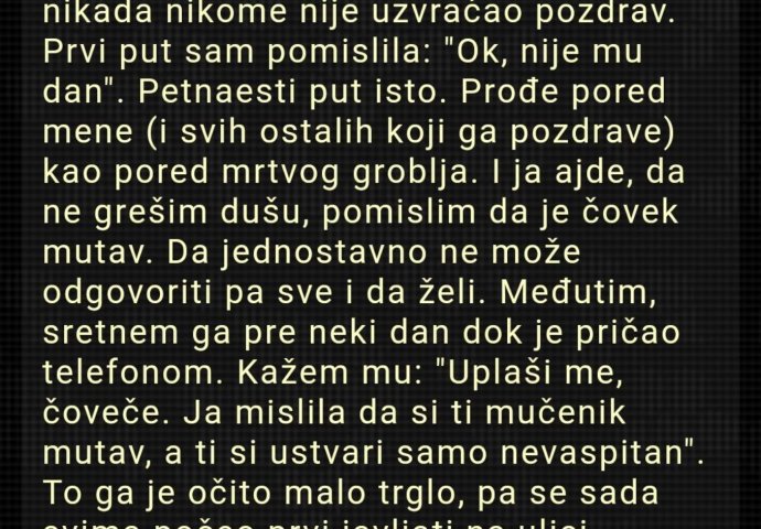 "Redovno sam u prolazu ljubazno pozdravljala jednog komšiju, koji nikada nikome nije uzvraćao pozdrav. Prvi put sam pomislila: "Ok, nije mu dan". Petnaesti put isto.
