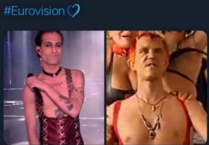 On je uz montažu na kojoj je frontmen glem-rok grupe "Maneskin" pored Djavola iz filma “Mi nismo anđeli” koga je tumačio daleke 1992. godine napsao “#eurovision2003”.