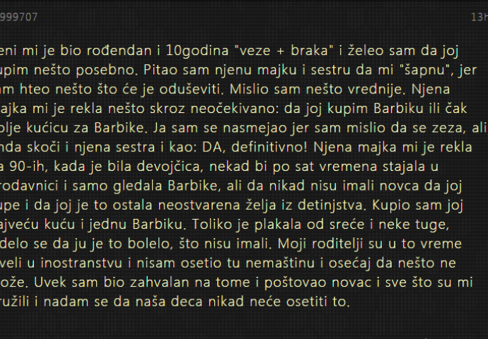 Mislio sam nešto vrijednije. Njena majka mi je rekla nešto skroz neočekivano: da joj kupim Barbiku ili čak bolje kućicu za Barbike. Ja sam se nasmijao jer sam mislio da se zeza, ali onda skoči i njena sestra i kao: DA, definitivno! Njena majka mi je rekla da 90-ih, kada je bila djevojčica, nekad bi po sat vremena stajala u prodavnici i samo gledala Barbike, ali da nikad nisu imali novca da joj kupe i da joj je to ostala neostvarena želja iz djetinjstva. Kupio sam joj najveću kuću i jednu Barbiku. Toliko je plakala od sreće i neke tuge, vidjelo se da ju je to boljelo, što nisu imali.