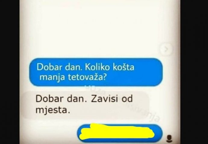IZ TATTOO STUDIJA SU MU REKLI DA CIJENA TETOVAŽE ZAVISI OD MJESTA: Zbog njegovog odgovora svi se valjaju od smijeha, MORALI SU OVO USLIKATI I OBJAVITI Kiosk 27.05.21. 18:17 Jedan nesporazum u komunikaciji i nastane hit slika. Jedan nesporazum u komunikaciji i nastane hit slika. Čovjek se kulturno javio i pitao za cijenu tetovaže. A evo gdje se dogodio nesporazum: Foto: Društvene mreže