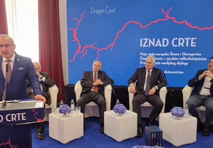 Na konferenciji, koja se održala u Velikoj dvorani palače HAZU-a, predstavljeno je četveroknjižje "Iznad crte" zamjenika predsjedatelja Doma naroda Parlamentarne skupštine BiH Dragana Čovića.