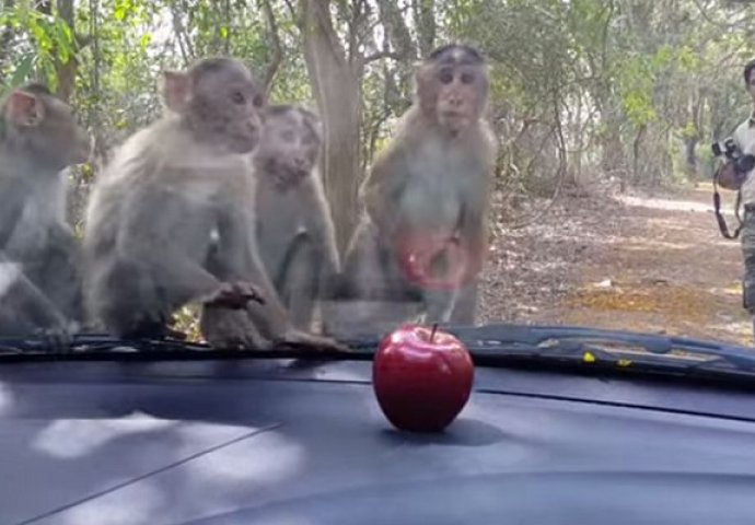 Upravo tako su se osjećali i ovi majmunčići koje je mamila jedna jabuka. Problem je bio u tome što su posjetioci ovog Safari parka, stavili jabuku ispred šoferšajbne, samo sa unutrašnje strane kola. Majmuni su se poredali u nadi da će uspjeti da je dohvate, čak su i gurali jedan drugog, ali im naravno nije uspjelo.