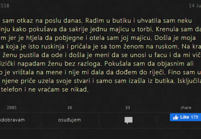 "Dala sam otkaz na poslu danas. Radim u butiku i uhvatila sam neku ruskinju kako pokušava da sakrije jednu majicu u torbi.