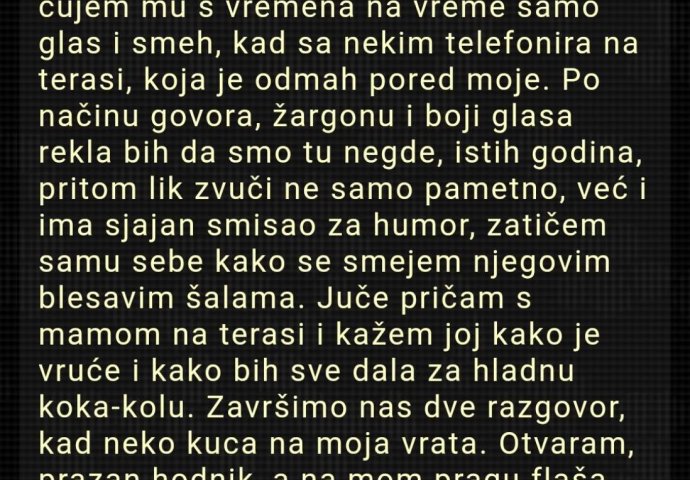Juče pričam s mamom na terasi i kažem joj kako je vruće i kako bih sve dala za hladnu koka-kolu. Završimo nas dvije razgovor, kad neko kuca na moja vrata.