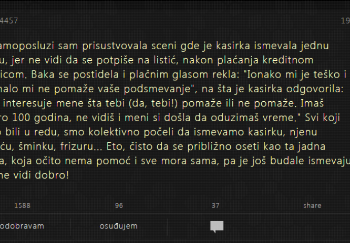 "U samoposluzi sam prisustvovala sceni gdje je kasirka ismijavala jednu baku, jer ne vidi da se potpiše na listić, nakon plaćanja kreditnom karticom.