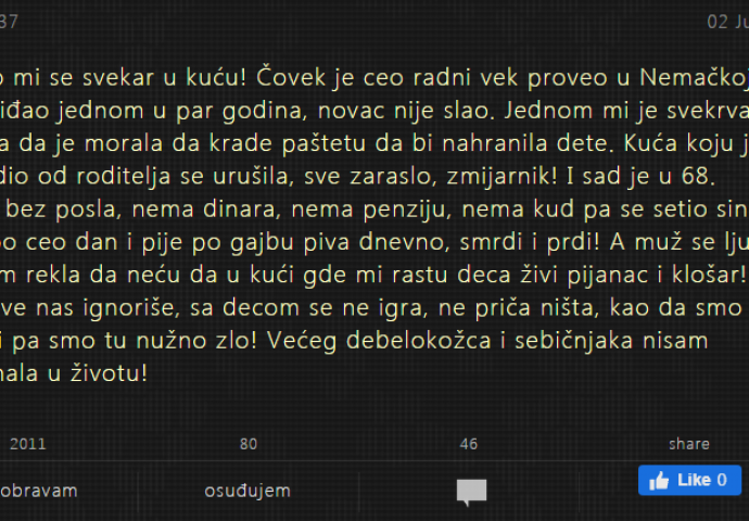 Čovjek je cijeli radni vijek proveo u Njemačkoj, sina viđao jednom u par godina, novac nije slao. Jednom mi je svekrva pričala da je morala da krade paštetu da bi nahranila dijete. Kuća koju je naslijedio od roditelja se urušila, sve zaraslo, zmijarnik!