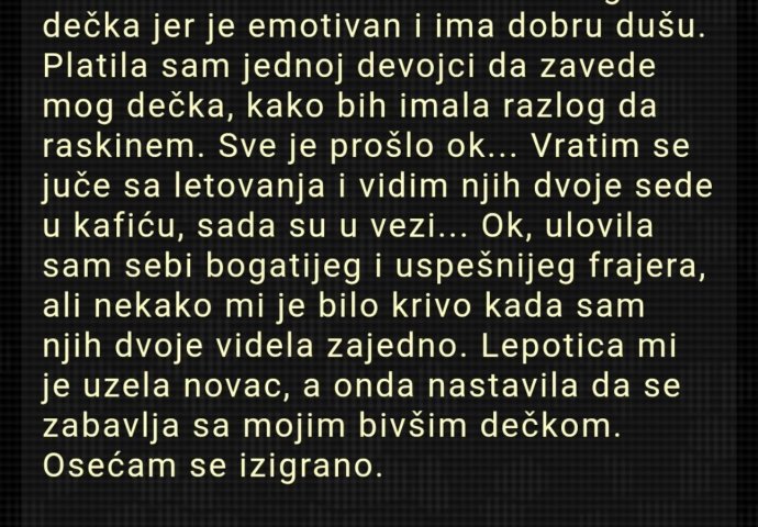 "Našla sam dobrostojećeg frajera na poslu, htio je da me vodi na more, ali nisam znala kako da ostavim svog dečka jer je emotivan i ima dobru dušu.