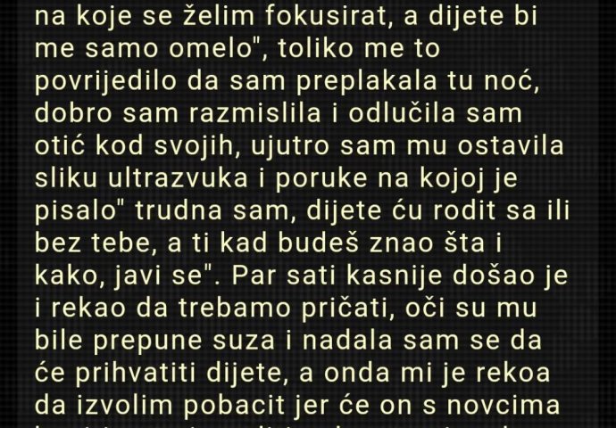 Prije neku večer htjela sam mu reći da sam trudna i nekako zanimalo me šta će reći pa sam ga pitala, rekao mi je " trenutno mi dijete nije potrebno, imam druge stvari na koje se želim fokusirat, a dijete bi me samo omelo", toliko me to povrijedilo da sam preplakala tu noć, dobro sam razmislila i odlučila sam otić kod svojih, ujutro sam mu ostavila sliku ultrazvuka i poruke na kojoj je pisalo" trudna sam, dijete ću rodit sa ili bez tebe, a ti kad budeš znao šta i kako, javi se".