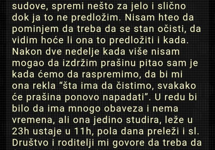 Nakon dvije nedjelje kada više nisam mogao da izdržim prašinu pitao sam je kada ćemo da raspremimo, da bi mi ona rekla “šta ima da čistimo, svakako će prašina ponovo napadati”. U redu bi bilo da ima mnogo obaveza i nema vremena, ali ona jedino studira, leže u 23h ustaje u 11h, pola dana preleži i sl. Društvo i roditelji mi govore da treba da ćutim, ali ja ne želim sutra sa ovakvom ženom da imam djecu i živim narednih XY godina, a opet u svemu ostalom mi odgovara i prvi put pred djevojkom mogu da budem 100% ono što sam."