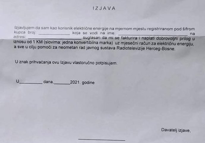 Korisnicima usluga Elektroprivrede HZHB na kućnu adresu je dostavljen obrazac za izjašnjavanje o tome da li žele izdvojiti 1 KM, odnosno, plaćati i podržavati rad RTV Herceg Bosne (RTV HB). Podsjetimo da je Dragan Čović, predsjednik HNS-a je u junu ove godine ovo predložio rekavši da bi naplata za RTV HB mogla početi od 1. jula. Naveo je da je prijedlog da uz račun za struju dolazi i naplata za RTV HB.